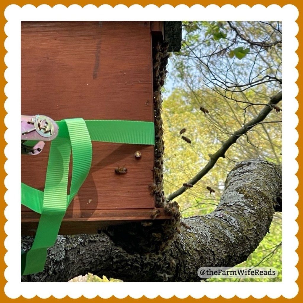 Turns out that Mr.’s grandma is a super swarm-spotter. Days after letting us know about the one pictured above {the brown swarm trap is situated near her house}, she called to tell us the air was full of bees: another swarm was happening. By the time we made it down, the bees had flown en masse to the area, clumped under the box/along the leg of the plant stand the trap is on, and disappeared into the box. She said it took a matter of minutes!