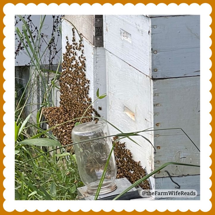 Bearding bees (please ignore the tall grass, we need to weedeat).