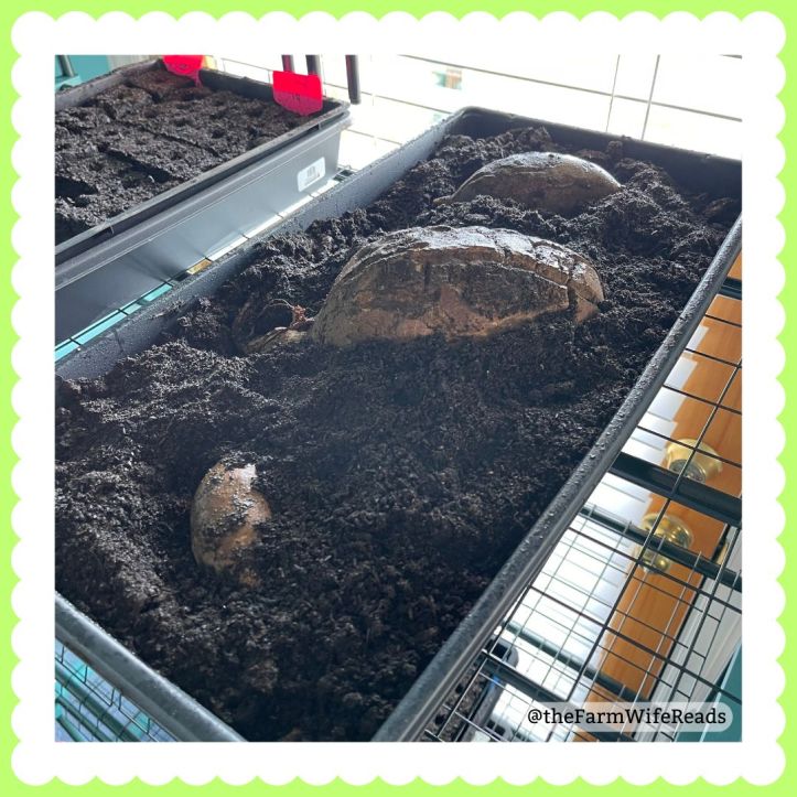 Another experiment underway is starting sweet potato slips. We saw this method on a From Scratch Farmstead video, and decided to see how it would work for us.