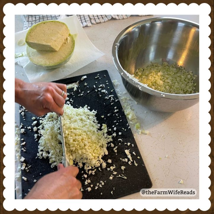 Chop kraut until your bowl is full. We use an 8-quart bowl for measuring out our cabbage, and transfer into a wider 13-quart bowl {that was Mr.’s grandma’s} to minimize the mess when mixing.