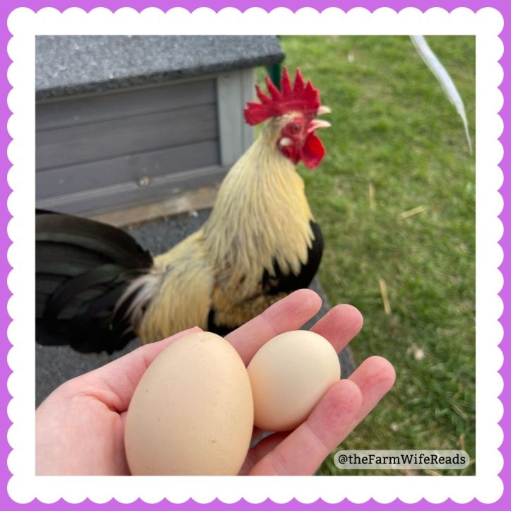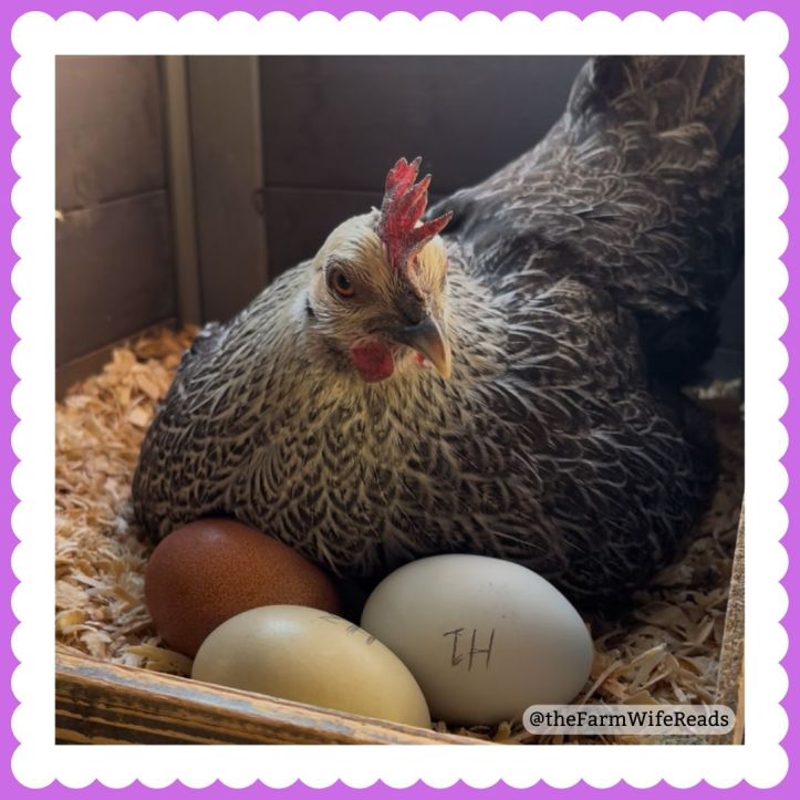 We gave her a few days to prove she was committed to the nest, and then I got eggs from the neighbor-cousin {who hatched Pepper, Pecan and Penguin}. With the hawk issues, we opted for full-size chickens over more Bantams {although I do want more of the tiny ones!}, and my request was “pretty eggs: I’m chasing the rainbow.” I think they delivered! Fingers crossed these are all hens. I posted a YT short of me giving her the eggs if you would like a laugh.